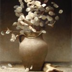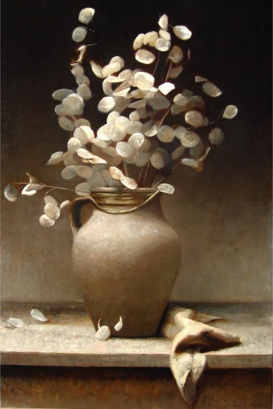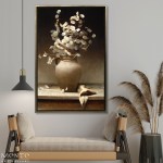 This photorealistic painting captures the timeless beauty of a still life arrangement. The centerpiece is a light brown vase with a narrow neck and wide body, filled with white flowers that have round petals. The flowers are arranged in a loose bouquet, with some stems and leaves visible, adding a touch of nature’s spontaneity to the scene. The vase is placed on a wooden shelf against a dark brown background, creating a beautiful contrast that highlights the flowers. On the right side of the shelf, there’s a folded cloth with a rough texture, adding an element of rustic charm to the painting.
