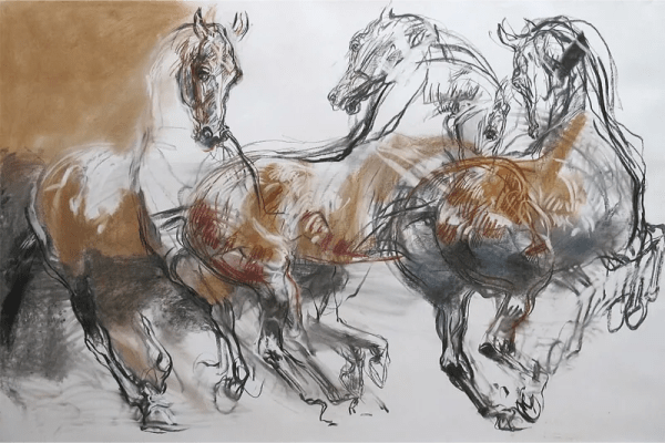“Gothic” is a captivating handmade sketch that captures the raw power and elegance of horses in motion. Rendered in a loose, expressive style, this artwork features four horses drawn in black, brown, and red tones, each in a unique pose—two facing left and two facing right—conveying movement and vitality.