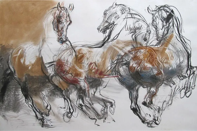 The artist’s use of dynamic lines and shading brings the scene to life, while the light beige background adds depth and balance, making the horses the focal point. The textured paper or canvas surface further enhances the authenticity and charm of the piece.