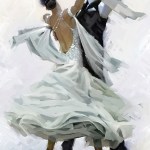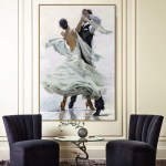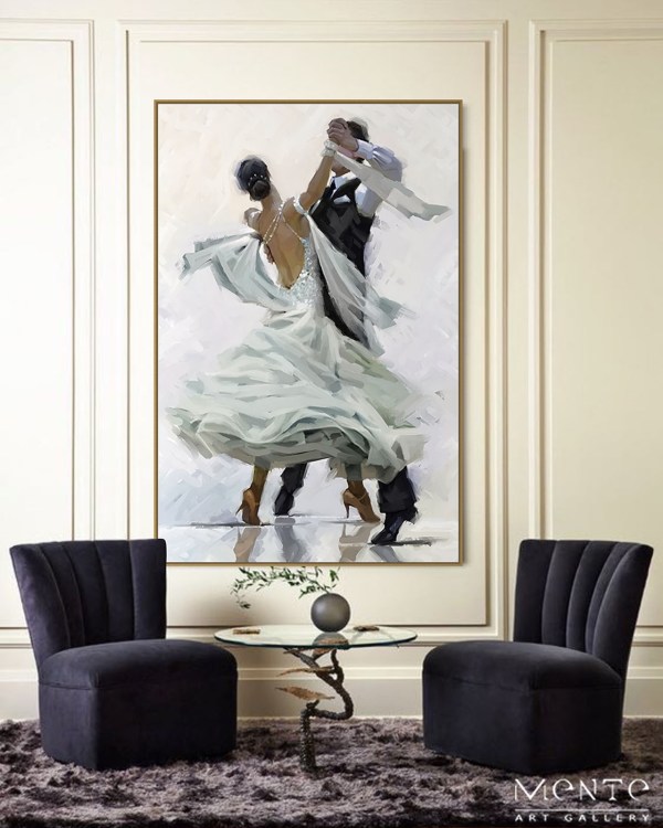 This exquisite handmade painting captures the elegance and fluidity of a dance in motion. The artwork features two dancers, gracefully intertwined, showcasing the beauty of their attire and the dynamic energy of their movement. The woman is adorned in a flowing light-colored dress that cascades beautifully, capturing the essence of motion. The male dancer is depicted in formal attire, complementing his partner’s elegance. The painting portrays two dancers mid-dance. Both are dressed elegantly; the woman in a flowing light-colored dress and the man in formal black-and-white attire. Their arms are extended, hands clasped together, emphasizing the dynamics of their dance. The brush strokes are expressive and fluid, conveying movement and energy. A neutral background accentuates the dancers, making them the focal point of this artwork. The color palette is soft yet contrasting enough to highlight details like the folds of the dress.