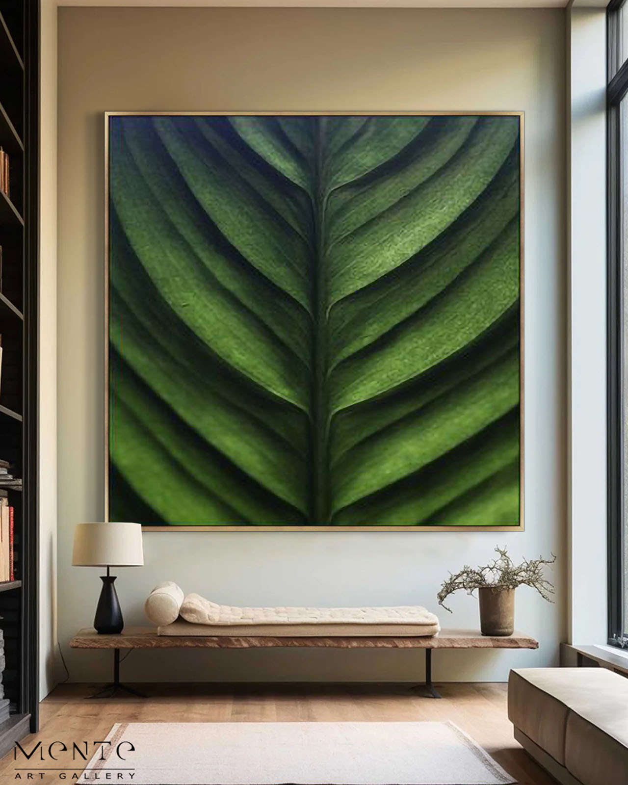 This is a captivating handmade painting that captures the intricate details and vibrant green hues of a leaf. The artist has skillfully rendered the texture and natural symmetry of the leaf, making it a stunning piece that brings the serene beauty of nature indoors. The image is a close-up painting of a green leaf. It features detailed brushwork to highlight the leaf’s texture and veins. Various shades of green are used to create depth and dimension. The leaf’s structure is symmetrical, with a prominent central vein from which other veins branch out. The painting has a realistic yet artistic feel, capturing both the essence and detail of the leaf. This painting is not just a decoration, but a statement of your refined taste and love for nature. Enjoy the serene beauty this painting brings to your space!