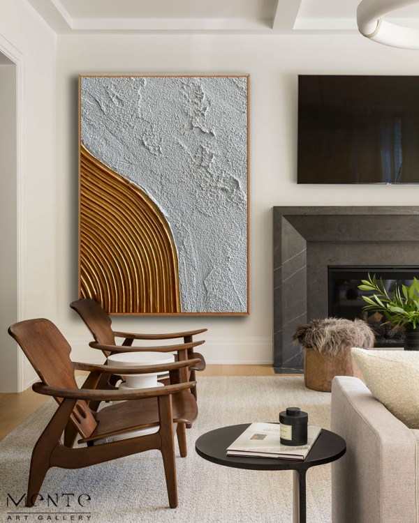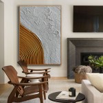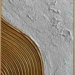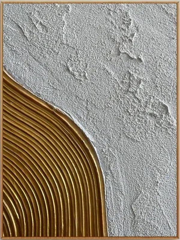 This handmade painting is a unique blend of texture and design. It features a textured white wall that exudes a rustic charm. The rough, textured surface of the wall, with its slightly raised areas, adds depth and character to the piece. On the right side of the painting, there’s a gold-colored, curved, ribbed design. This design is made up of multiple curved lines that create a ribbed effect, adding an element of sophistication and elegance to the artwork.