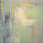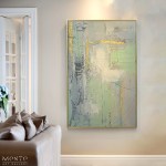 This is a stunning handmade painting that showcases an abstract design. The artwork features a harmonious blend of light green, gray, and white colors, beautifully accentuated with touches of gold. The painting exhibits a textured surface, with lines and shapes interweaving to create a layered effect. This square-shaped painting, displayed against a white background, exudes a sense of tranquility and sophistication. Its abstract nature allows viewers to interpret and connect with the artwork in their own unique way. This piece would make an elegant addition to any space.