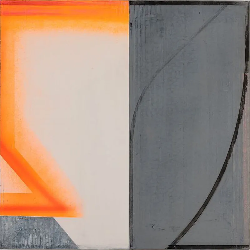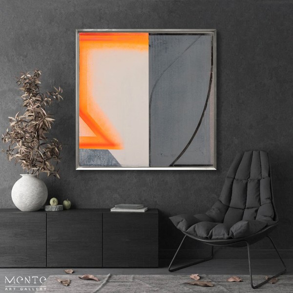 This is a unique abstract painting that is sure to add a contemporary touch to any space. The artwork is divided into two panels, each with its own distinct design. The left panel features a square with an orange gradient background and a white square in the center, creating a warm and inviting atmosphere. The right panel, on the other hand, is a rectangle with a gray background and a black diagonal line running through it, adding an element of intrigue to the piece. The painting is framed in a thin black frame, giving it a polished and professional look. This one-of-a-kind piece would make an excellent addition to any art collection or as a statement piece in your home or office. Its distinctive design makes it versatile enough to complement a variety of decor styles.
