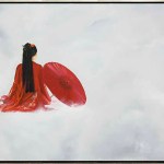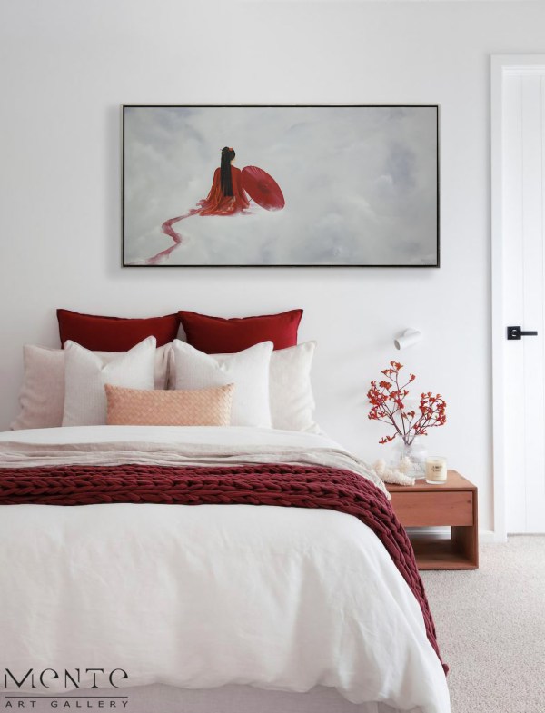 Hana is a captivating handmade painting depicting a graceful woman in a flowing red dress, holding a matching parasol as she appears to float amidst the clouds. The vibrant red contrasts beautifully against the serene, light blue sky, creating a striking focal point that draws the eye. Her dress billows elegantly, evoking a sense of motion and freedom, while the dreamy, cloud-filled background adds an ethereal quality to the piece.