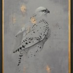 Crafted in a monochromatic palette, the falcon features black speckles and detailed linework, which contrast beautifully against the light gray background. Elegant gold accents add a luxurious touch, enhancing the depth and sophistication of the piece.