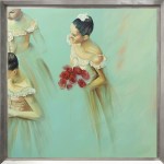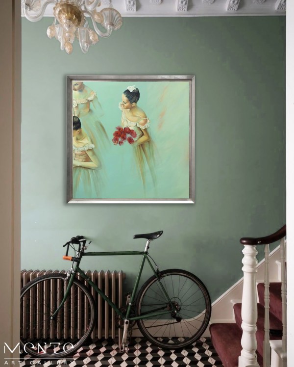 This is a captivating handmade painting that features three ballerinas set against a soft green background. The ballerinas, each in a different pose – standing, sitting, and kneeling, are beautifully depicted wearing white tutus and holding red roses. The background is painted in a soft green color with visible brushstrokes, adding depth and texture to the piece. The painting is framed in a sleek silver frame, enhancing its elegance. This artwork would make a delightful addition to any collection, bringing a touch of grace and charm to any space. Please note that due to its handmade nature, each piece may have slight variations, making it unique. Enjoy this exquisite piece of art!