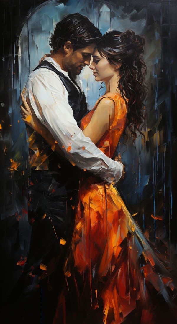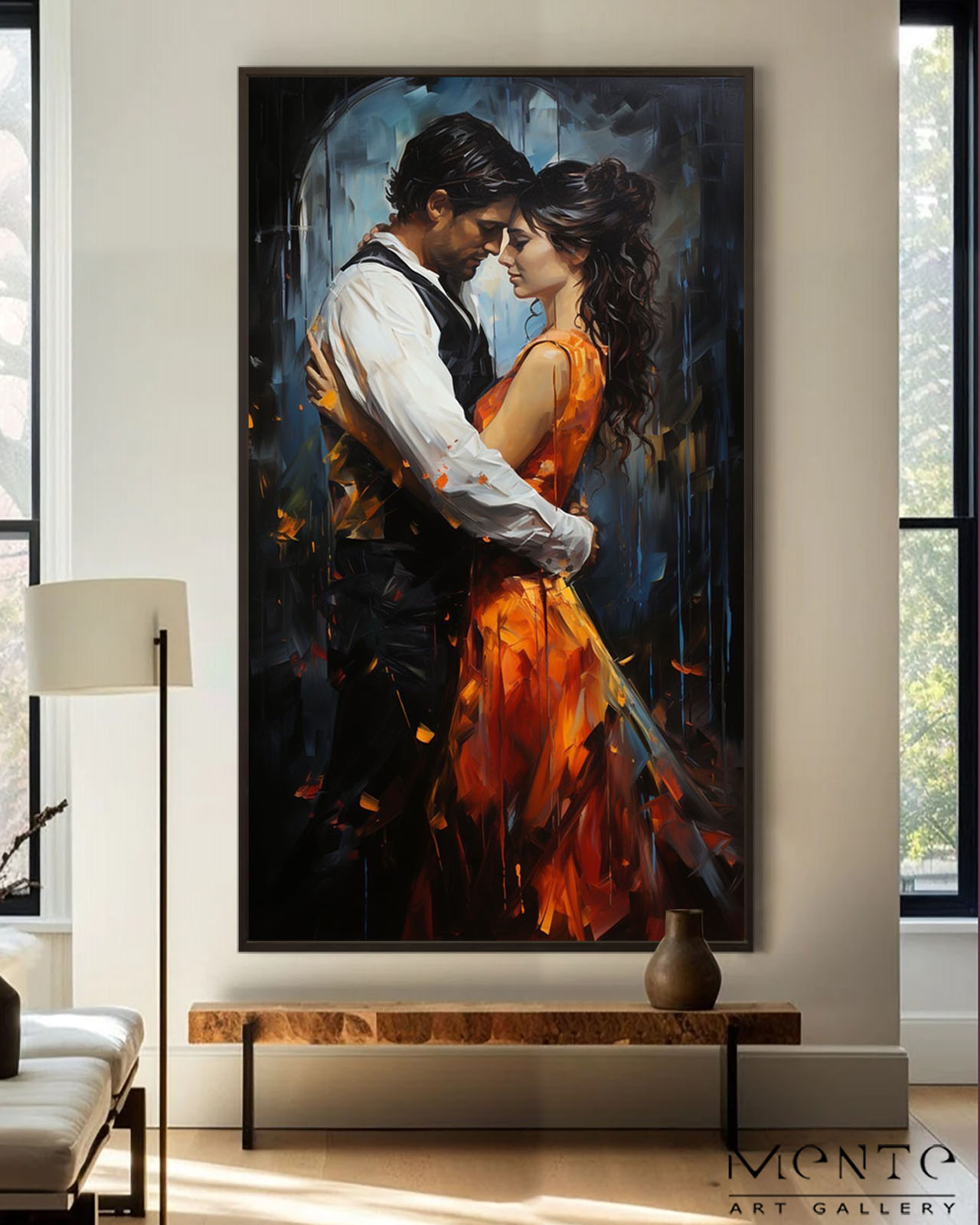 The painting portrays two individuals engaged in a dance. A woman wearing an elegant, flowing orange dress that’s brought to life with dynamic brush strokes. A man in classic attire including a white shirt and black pants. The background features abstract elements with dark hues, creating a dramatic atmosphere. Bright splashes of color around the figures suggest movement and energy. The overall mood of the painting is passionate and romantic. This painting would make a wonderful addition to any home or office, bringing a touch of nature’s beauty indoors.