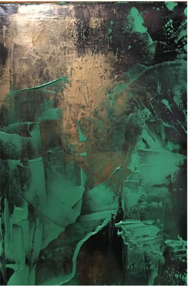 This is a striking abstract painting that is sure to captivate any viewer. The painting features a textured surface with a mix of brushstrokes and drips, predominantly in black, gold and green colors. The few areas of bright green and gold stand out against the darker background, creating a visually compelling piece. The painting is displayed on a white wall, enhancing its modern aesthetic. The abstract nature of the painting invites viewers to interpret and find their own meaning in it, making it a conversation starter. This handmade painting is not just an art piece – it’s an expression of style and taste. Its abstract nature and unique color palette make it a standout piece that would be a great addition to any art collection.
