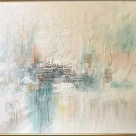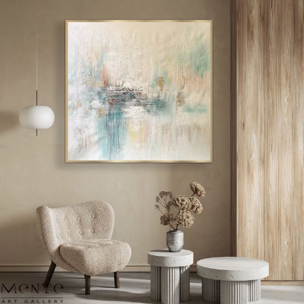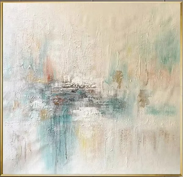 This is a captivating handmade painting that showcases an abstract style. The artwork is set on a square canvas and framed in gold, adding a touch of elegance. The painting features a white background with a harmonious blend of blue, orange, and black colors. These colors are blended together in a way that creates a sense of depth and texture, making the piece visually intriguing. This piece would make a sophisticated addition to any collection or space.