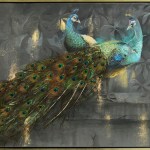 Immerse yourself in the majestic beauty of “Keshmir 2,” a captivating handmade painting featuring two peacocks facing each other with their tails fanned out in full splendor. Painted in vibrant shades of blue, green, and gold accents, the peacocks command attention against a dark forest backdrop filled with intricate trees and foliage.