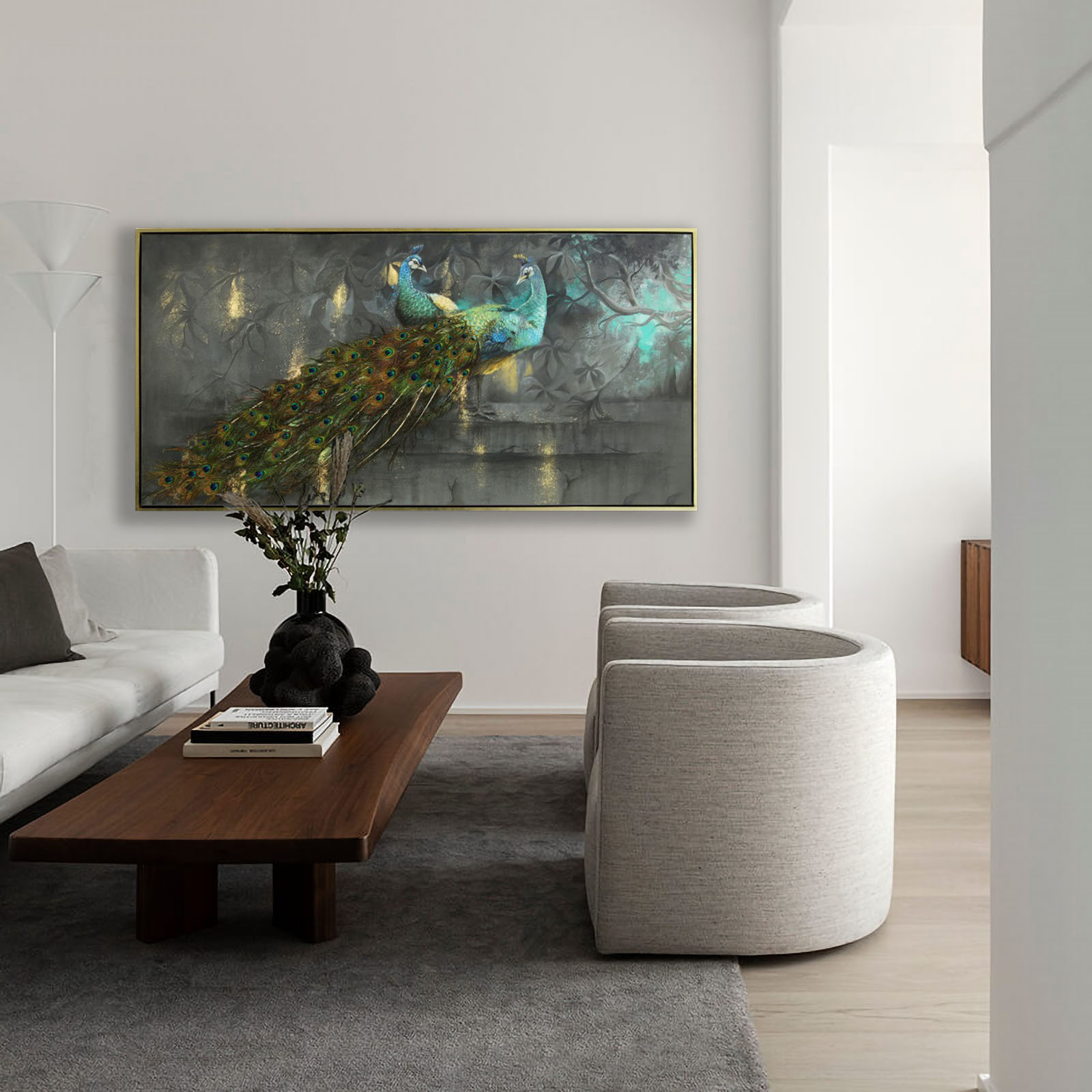 The contrast between the luminous colors of the birds and the shadowy forest background creates a stunning visual impact that brings elegance and drama to any space. Rendered in a realistic style, this artwork invites viewers to explore the intricate details and personal meanings within the scene.
