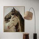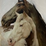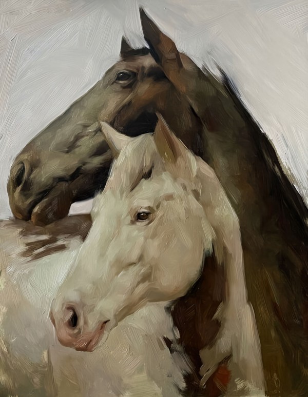 Discover the serene beauty of “Lean,” a captivating handmade painting that masterfully portrays the tender connection between two horses. This artwork features one dark brown horse with lighter highlights and a white horse with subtle grey undertones, their forms brought to life through intricate brushwork and rich textures.