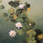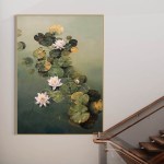This is a beautiful photo realistic image of a pond with lily pads and white flowers that will create a relaxing and soothing mood in your space. The image depicts a pond with green and round lily pads and white flowers with yellow centers, floating on the still water. The background is a gradient of green and blue, giving the impression of a natural environment. The image is vertical, which makes it suitable for narrow spaces or walls. The image has a peaceful and serene feel to it, as the lily pads and flowers are in full bloom and the water is calm. This image is ideal for anyone who loves nature or water, and wants to add some freshness and tranquility to their space.