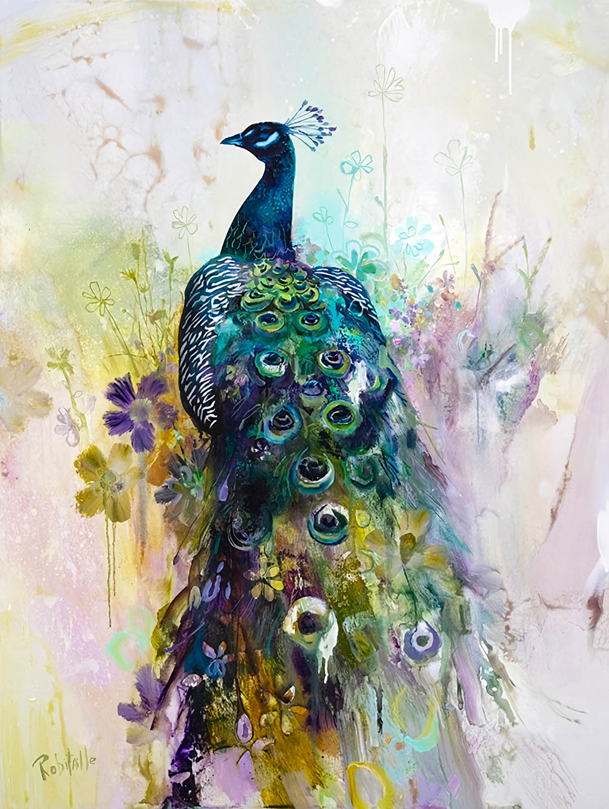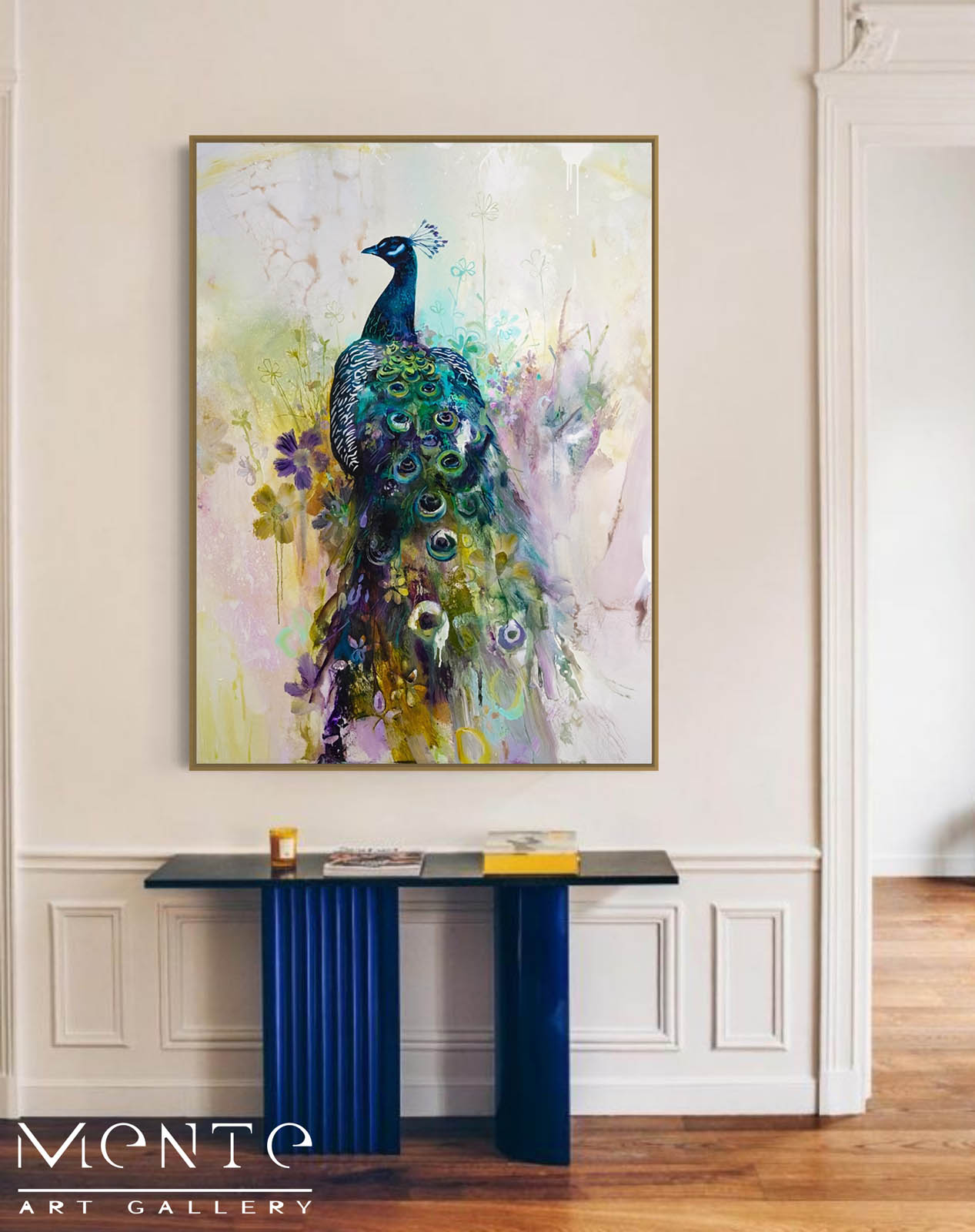 “Lupin” is a breathtaking handmade painting that captures the majestic beauty of a peacock with its tail feathers fully spread in a dazzling display. The vibrant artwork features the peacock standing gracefully on a branch, its head turned to the left, surrounded by lush green foliage and delicate purple flowers.