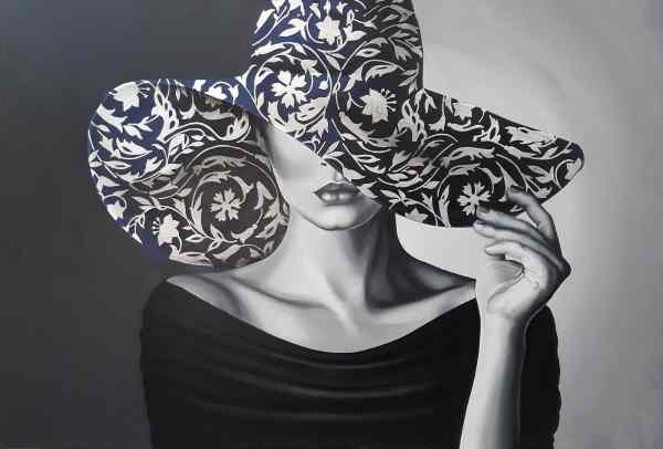 This is a handmade painting that beautifully captures the elegance and mystery of a woman wearing a large hat with a floral pattern. The painting is done in black and white, giving it a timeless and classic appeal. The woman, depicted wearing a black off-the-shoulder top, adds a touch of sophistication to the piece. The hat, which is white with a blue floral pattern, covers the woman’s face, adding an element of intrigue. The woman is holding the brim of the hat with one hand, further enhancing the painting’s dynamic composition. The background is a gradient from light to dark gray, providing a subtle backdrop that allows the woman and the hat to stand out prominently.