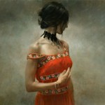This artwork is a captivating, photo-realistic image of a woman elegantly dressed in a red floral dress. The dress, adorned with white and orange flowers, has an off-the-shoulder neckline that adds a touch of sophistication. Complementing the dress is a stylish black choker necklace. The woman’s face is artistically blurred, adding an element of mystery and intrigue to the piece. Her hair is styled in an elegant updo, further enhancing the overall aesthetic. The background features a textured blue-grey color that beautifully contrasts with the vibrant red of the dress. This piece exudes a sense of elegance and sophistication, making it a perfect addition to any space.