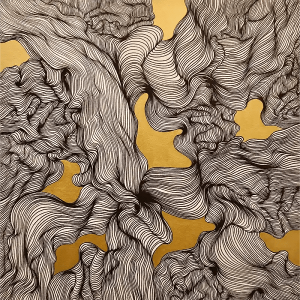 The densely packed lines introduce a sense of depth and texture, while their undulating motion brings an almost meditative quality to the piece. The flat, vivid yellow backdrop amplifies the contrast and energy of the line work, making the entire composition come alive.