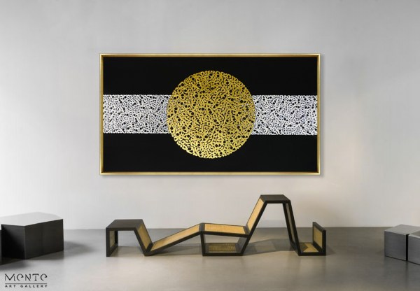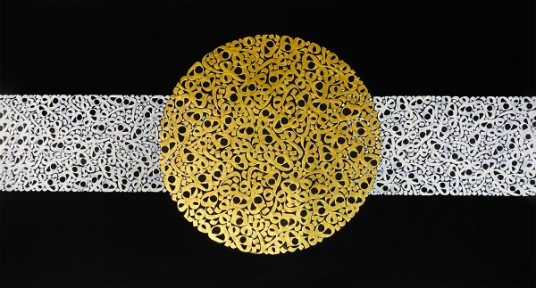 The artwork features a refined palette of black, white, and gold, with a striking circular gold centerpiece layered over an intricate horizontal band of white patterns. Set against a solid black background, the composition plays with light and structure to achieve a sculptural, dimensional effect. The use of fine detailing and layered surfaces encourages close viewing and personal interpretation.