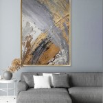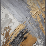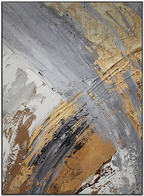 This is a dramatic and bold abstract painting that showcases a dynamic interplay of gray, black, white, and gold hues. The artwork is characterized by its mix of different textures and brushstrokes, creating a layered effect that adds depth and dimension. The painting is predominantly gray and white, with gold accents adding a touch of luxury and black lines providing contrast. The square format of the painting, framed with a white border, makes it a versatile piece that can fit into various spaces. This handcrafted painting is not just a decor item, but a conversation starter that adds character to your space. Its abstract nature allows viewers to interpret it in their own way, adding a personal touch to their space.