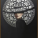 This is a striking handmade painting featuring a black and white floral design in a circular shape. The painting indeed features a woman’s face inside the circle, and the circle does resemble a hat. This adds a unique and intriguing element to the artwork. The intricate and symmetrical floral design around the woman’s face further enhances the beauty of the painting. The contrast of black and white colors adds depth and makes the design stand out. This painting would make a stunning addition to any collection or decor.