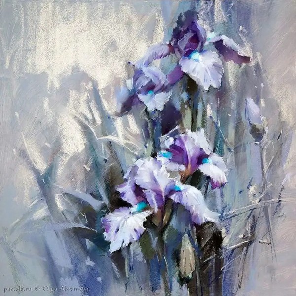 This is a handmade painting that beautifully captures a bunch of purple and white iris flowers. The flowers, which are the focal point of the painting, are depicted with an impressive level of detail, making them come alive on the canvas. The background is a mix of light and dark blue, with hints of green and white, creating a serene and calming atmosphere. The painting is done in an impressionistic style, characterized by loose brushstrokes and a textured surface, adding depth and dimension to the artwork.