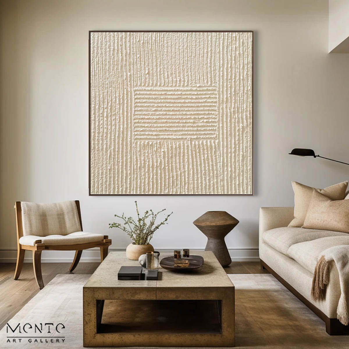 The use of a monochromatic color palette in shades of beige and cream enhances the subtlety and elegance of the piece, making it a versatile addition to various interior design styles. This painting stands out for its minimalist yet intricate design, which can complement both modern and traditional decor.