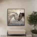 More than just artwork, “Pash” is a testament to the beauty, grace, and emotional depth of these majestic animals. The faint outline of a fence in the background adds a touch of rustic charm, making this piece a conversation-starting centerpiece for any space.