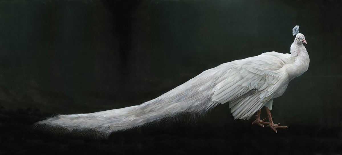 Perfect for wildlife art collectors, interior designers, and those seeking sophisticated statement pieces, “Pavo” brings an air of refined tranquility to any space. The stark contrast between the radiant bird and its shadowy backdrop creates dramatic visual impact, making this painting equally suited for modern lofts and traditional interiors.