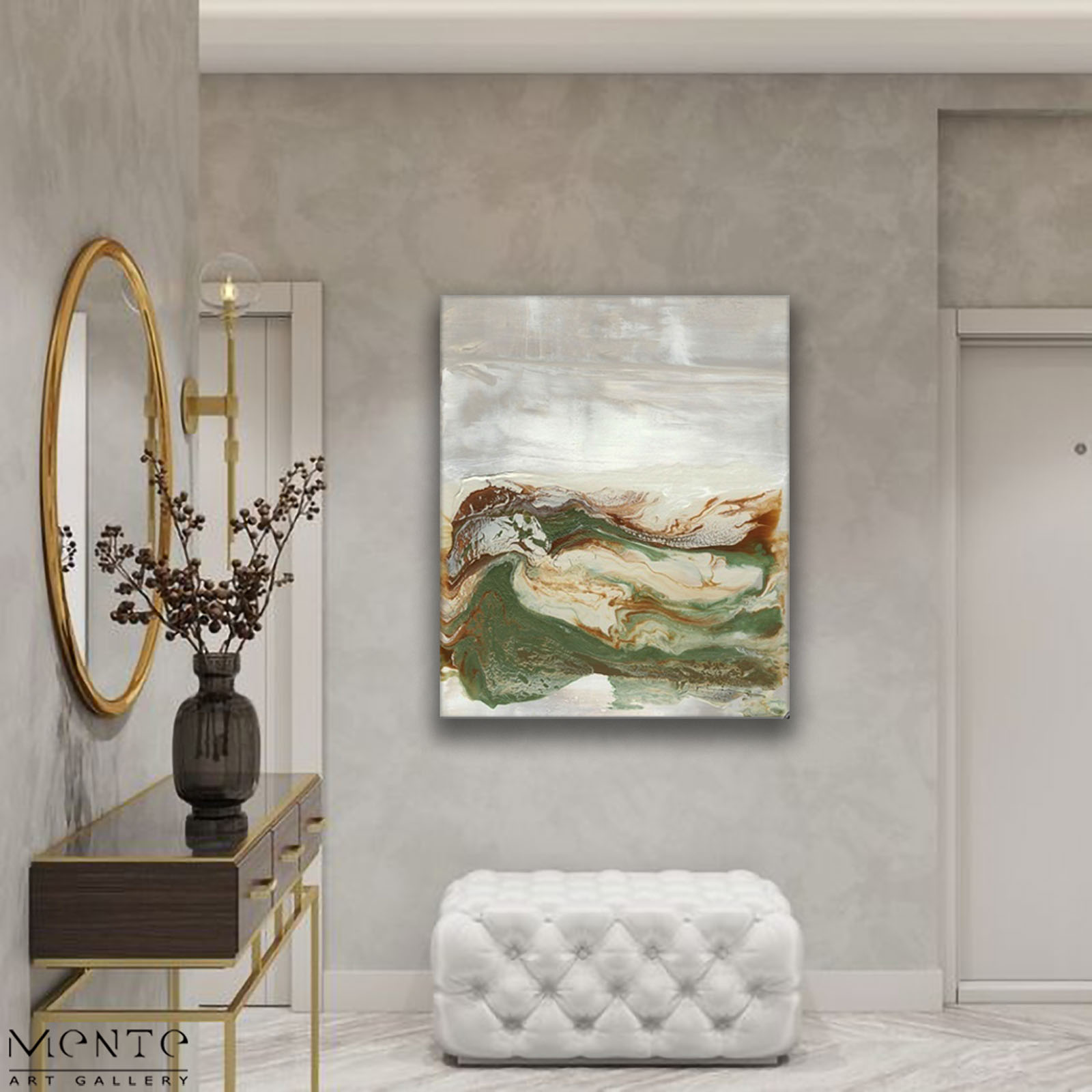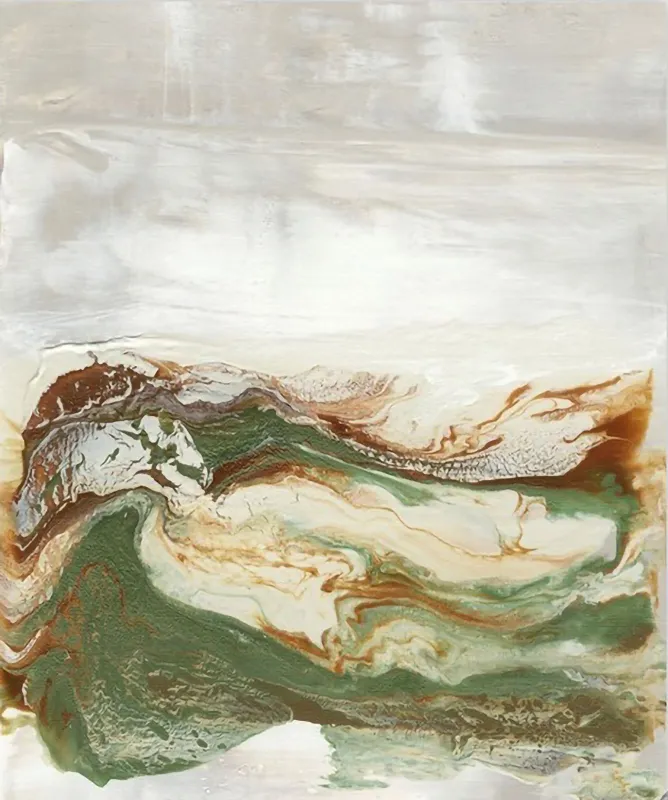 This is a handmade abstract painting that beautifully captures the essence of a mountain landscape. The artist has skillfully used a color palette of white, beige, brown, and green to create a serene and calming scene. The painting depicts a mountain range under a cloudy sky, done in a fluid style with the colors blending into each other. This technique gives the painting a dreamlike quality, as if capturing a fleeting moment in nature.