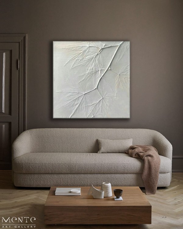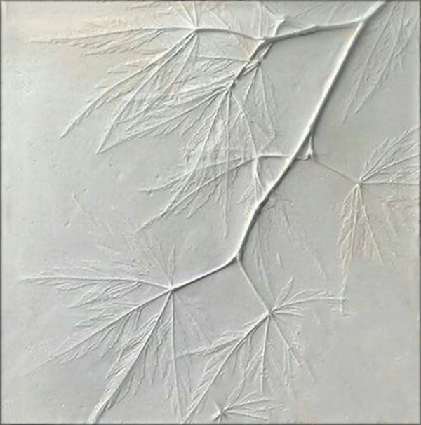 This piece is a unique artwork featuring a white textured wall adorned with a pattern of leaves. The leaves, rendered in a light grey color, are arranged in a random pattern, adding an element of intrigue to the piece. The realistic texture of the leaves appears to be embossed on the wall, creating a tactile appeal that invites touch. The wall has a slight sheen to it, and the leaves cast a soft shadow, enhancing the depth and dimensionality of the artwork. This piece is presented in a square format with a border, making it a versatile addition to any space. This artwork would make an appealing addition to any online store collection, perfect for customers seeking art that brings a sense of tranquility and natural beauty to their space.