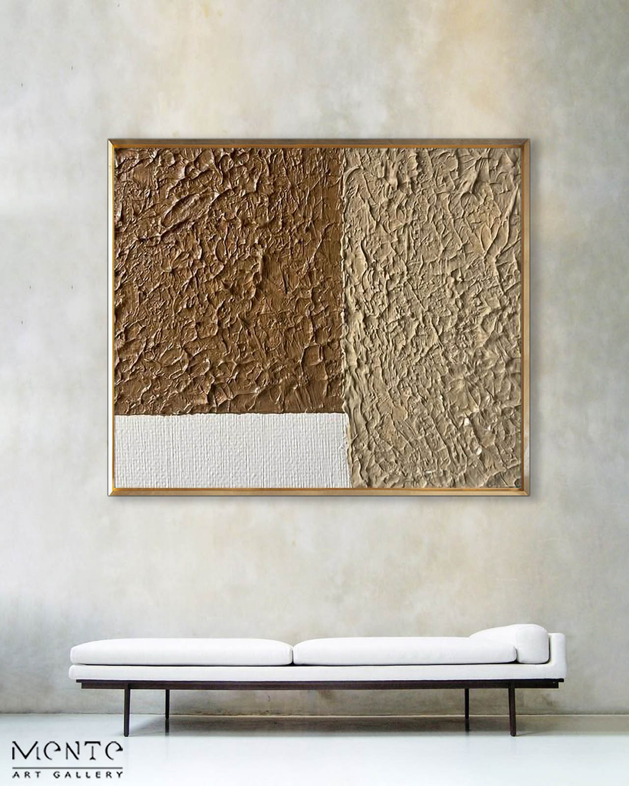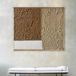 This is a handmade painting that beautifully captures the artistry of texture and color. The painting features a wall with three different finishes, each unique in its own way. The top left corner showcases a dark brown finish with a rough texture, adding depth and character to the piece. The top right corner contrasts this with a lighter beige finish that has a smoother texture, providing a soothing visual balance. The bottom half of the painting is done in white, with the left corner having a smooth texture and the right corner featuring a rough texture. This juxtaposition of smooth and rough textures within the same color scheme adds an intriguing element to the artwork. This painting is not just an artwork; it’s a celebration of texture and color. Its unique design makes it a perfect addition to any art collection or living space.