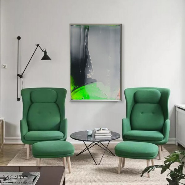 This is a captivating abstract painting that is sure to add a touch of modern sophistication to any space. The artwork features a predominantly green and grey color scheme, set within a black border that adds a polished touch. The painting has a glossy finish, enhancing its visual appeal. The composition is divided into various areas of color – a large green area at the bottom, a black and white area at the top, and alternating black and white areas on the sides. This unique piece would make an excellent addition to any art collection or as a statement piece in your home or office. Its distinctive design makes it versatile enough to complement a variety of decor styles.