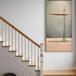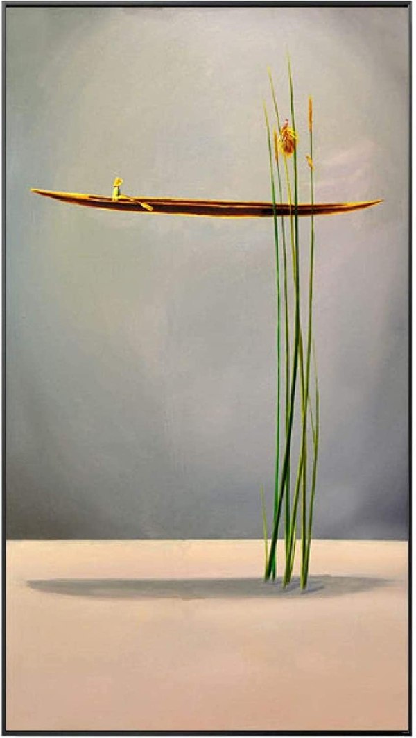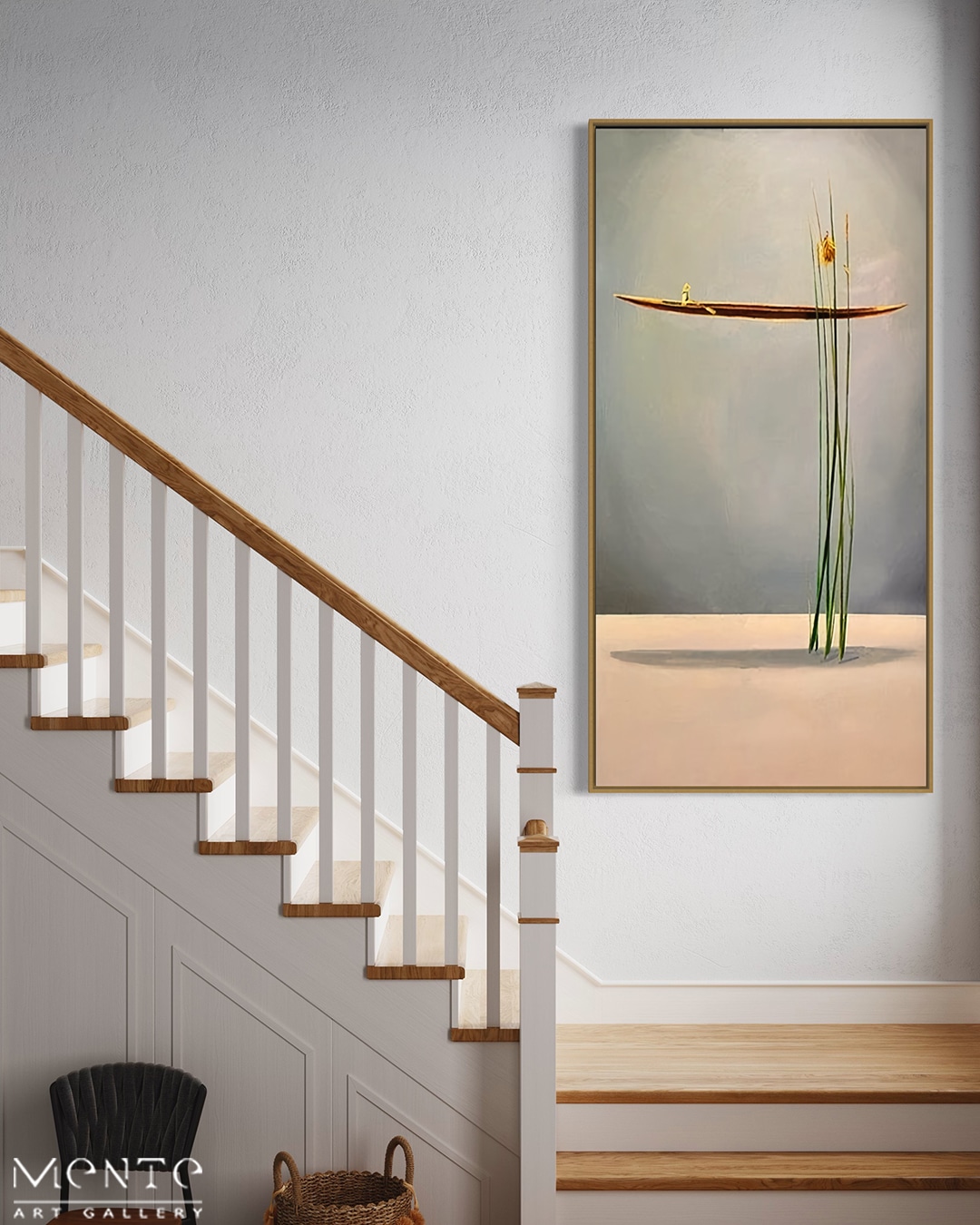 The painting belongs to the surrealism sub-category, which features paintings that explore the subconscious and the imagination. The painting shows a golden canoe with two figures on it, suspended in mid-air by a thin wire. The background is a gradient of light blue to grey, creating a sense of depth and mystery. The figures are small and not detailed, but they seem to be human. The painting has a dream-like quality, and it invites the viewer to wonder about the story behind it. The painting is a unique and captivating piece of art, and it would make a perfect gift for someone who loves surrealism and adventure.