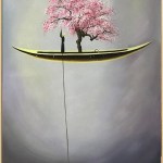 This exquisite handmade painting captures a serene and mystical scene. A golden canoe is delicately balanced on a thin, vertical line, symbolizing equilibrium and harmony. A flourishing pink cherry blossom tree, in full bloom, graces the canoe, adding a touch of nature’s elegance. The backdrop is painted with soft hues of grey and blue, evoking a tranquil atmosphere under the watchful gaze of a pale moon.
