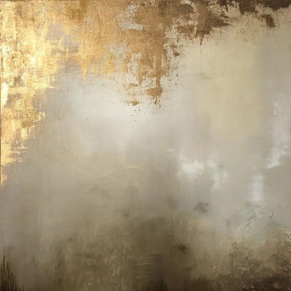 This is a captivating abstract painting that is sure to add a touch of modern sophistication to any space. The artwork features a predominantly gold and white color scheme, giving it a warm and inviting feel. The gold color is concentrated on the top left corner and fades into white towards the bottom right corner, creating a sense of movement and depth. The painting has a textured surface with visible brushstrokes, adding an element of authenticity and complexity to the piece. The painting is on a square canvas, making it versatile enough to fit in a variety of spaces. This unique piece would make an excellent addition to any art collection or as a statement piece in your home or office.