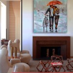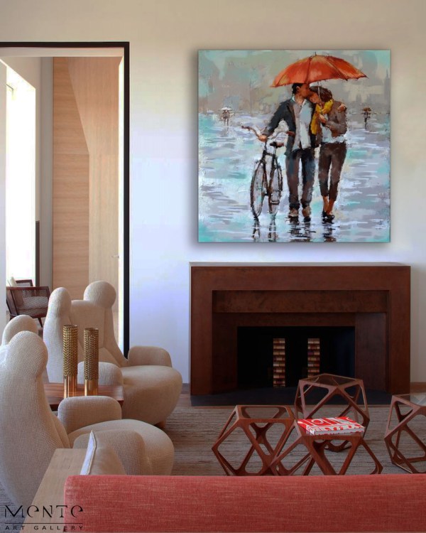 Rainy Date 2 is an impressionistic handmade painting that beautifully depicts a romantic scene of a couple walking in the rain under a vibrant red umbrella. The man tenderly holds the umbrella over the woman while guiding a bicycle, symbolizing care and affection. The wet street reflects the cityscape of surrounding buildings and trees, adding depth and atmosphere to the composition. Cool tones dominate the palette, with the striking red umbrella serving as the focal point, creating a dramatic contrast. Perfect for art lovers and collectors, this painting adds warmth, romance, and elegance to any living space. Each piece is handmade, ensuring that every artwork is unique.