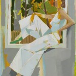 This is a charming painting of a woman sitting on a porch that will add some style and personality to your space. The painting is done in a modern style with flat colors and geometric shapes, creating a sleek and minimalist look. The woman is wearing a white dress and is sitting on a white chair, which contrasts with the greens, yellows, and whites of the background. She is leaning back with her legs crossed and her arms resting on the armrests, showing her relaxed and confident attitude. The background is a porch with a railing and trees in the background, giving the impression of a cozy and natural setting. This painting is perfect for anyone who loves modern art or portraits, and wants to add some flair and character to their home or office.