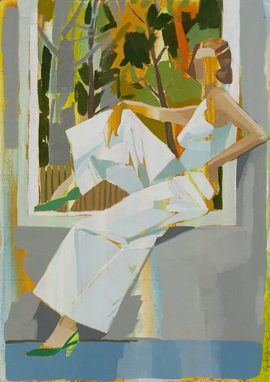 This is a charming painting of a woman sitting on a porch that will add some style and personality to your space. The painting is done in a modern style with flat colors and geometric shapes, creating a sleek and minimalist look. The woman is wearing a white dress and is sitting on a white chair, which contrasts with the greens, yellows, and whites of the background. She is leaning back with her legs crossed and her arms resting on the armrests, showing her relaxed and confident attitude. The background is a porch with a railing and trees in the background, giving the impression of a cozy and natural setting. This painting is perfect for anyone who loves modern art or portraits, and wants to add some flair and character to their home or office.