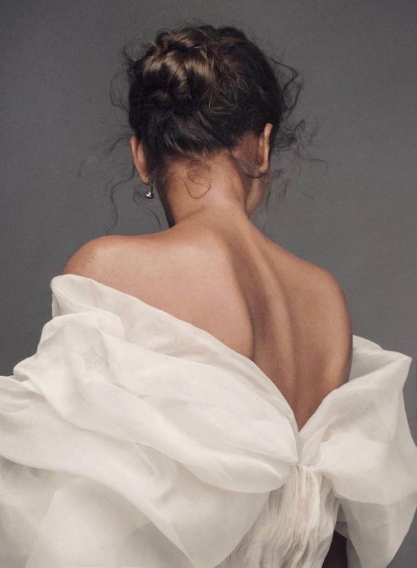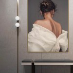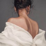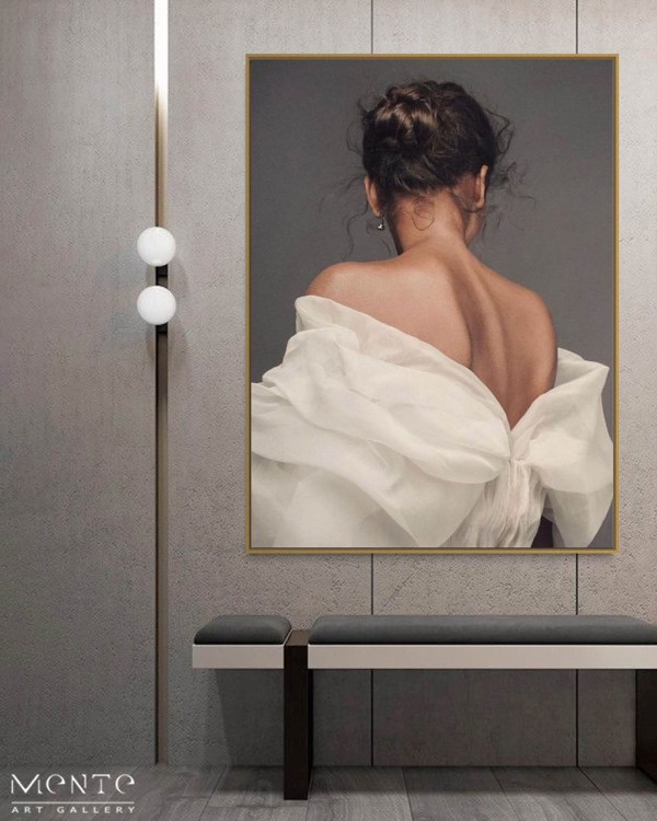 This is a stunning painting of a woman’s back and neck that will add some elegance and style to your space. The painting is a photo of a woman wearing a white off-the-shoulder dress with a large bow on the back. The dress is made of a light, flowing fabric, which gives it a feminine and romantic look. The woman’s hair is styled in a messy bun with loose strands framing her neck, which adds some texture and charm to the painting. She is wearing a pair of dangling earrings, which complement the color and shape of the bow. The painting has a simple and minimalist design, but also a rich and sophisticated appearance. This painting is ideal for anyone who loves fashion or portraits, and wants to add some flair and grace to their home or office.