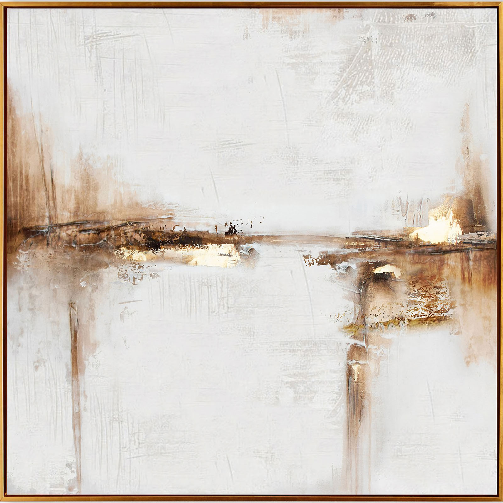 This is a captivating handmade painting that showcases an abstract design. The artwork features a white background with accents of gold and brown, creating a harmonious color palette. The painting appears to be made with a combination of brushstrokes and palette knife techniques, resulting in a textured appearance that adds depth to the piece. Framed in a simple wooden frame, this painting would make a sophisticated addition to any collection or space.