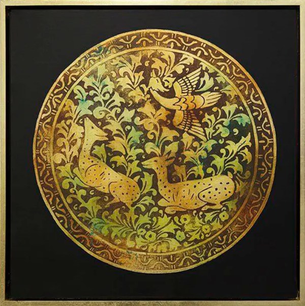 This is a stunning handmade painting featuring a circular design with intricate patterns and motifs. The artwork is done in warm colors and features a deer on the left and a bird on the right. The background is black, which makes the gold, green, and red colors of the design stand out prominently. The deer and bird are surrounded by intricate patterns and motifs, adding depth and interest to the piece. The painting is framed in a black frame, which complements the artwork beautifully. This painting would make a beautiful addition to any collection or decor.
