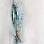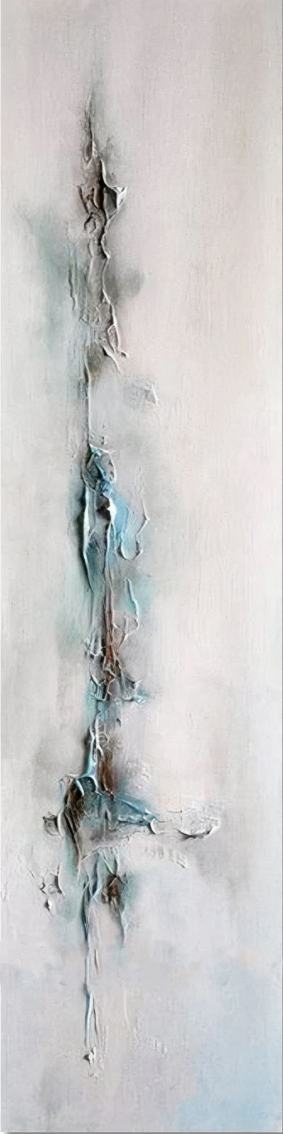 This is a mesmerizing abstract painting that is sure to add a touch of modern elegance to any space. The artwork features a predominantly white background with a vertical line of blue and gray colors that appear to be dripping down the canvas. The colors are layered and textured, creating a sense of depth and dimension. The painting is on a vertical canvas, giving it a clean and minimalist look. This piece would make an excellent addition to any art collection or as a statement piece in your home or office. Its distinctive design makes it versatile enough to complement a variety of decor styles.