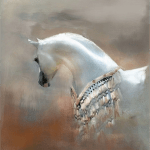 This enchanting original painting captures a mystical white horse with flowing azure mane and tail, adorned with an intricate beaded harness that shimmers against the soft beige backdrop. The artist’s ethereal brushwork creates a dreamlike atmosphere, where the horse’s poised movement seems to transcend reality. Every detail—from the hand-painted beads to the textured background—invites viewers into a whimsical equestrian fantasy.