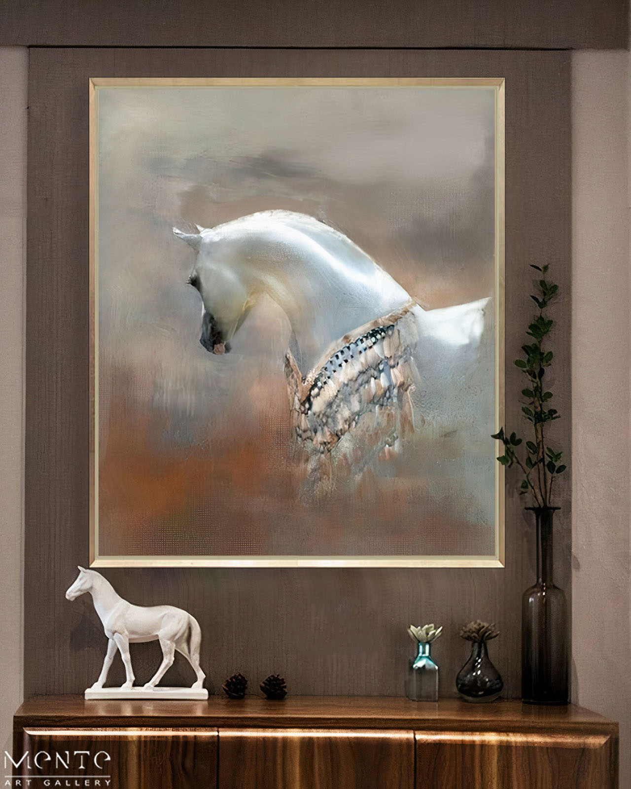 This enchanting original painting captures a mystical white horse with flowing azure mane and tail, adorned with an intricate beaded harness that shimmers against the soft beige backdrop. The artist’s ethereal brushwork creates a dreamlike atmosphere, where the horse’s poised movement seems to transcend reality. Every detail—from the hand-painted beads to the textured background—invites viewers into a whimsical equestrian fantasy.