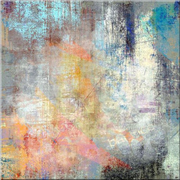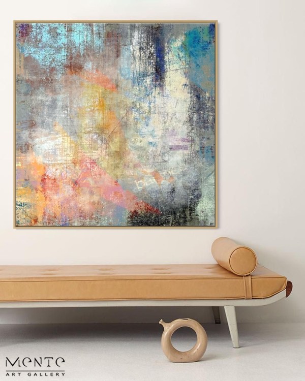 This handmade painting is an abstract piece that features a mesmerizing blend of colors and textures. The artwork is dominated by soft hues of blue, orange, and grey that meld together in a harmonious dance. The use of color is both bold and subtle, creating a visual experience that is both invigorating and calming. The textured layers add depth to the piece, inviting the viewer to explore the intricate details that reveal themselves upon closer inspection. The painting has an ethereal quality with the soft blending of colors giving it a dreamlike appearance. It exudes a sense of calmness yet complexity due to its intricate layering. The painting would make a stunning addition to any space, offering an element of modern elegance and artistic flair.