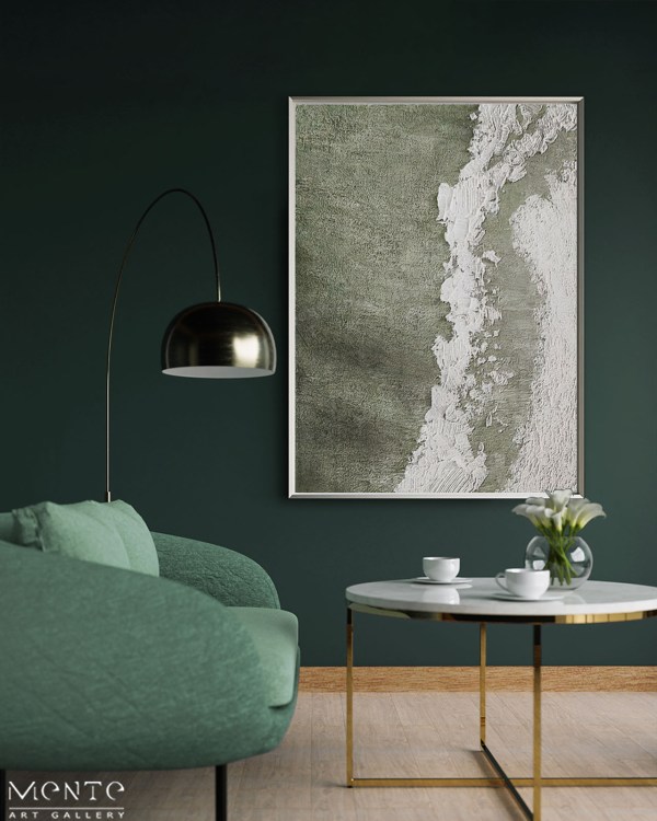 This abstract painting is a captivating blend of texture and color. The painting features a predominantly green and white color palette, creating a soothing and calming effect. A diagonal white line runs from the top right corner to the bottom left corner, adding a dynamic element to the composition. The white line has a rough texture and appears to be made of thick paint, providing a stark contrast to the smooth green background, which appears to be made of thin paint. This contrast between the rough and smooth textures adds depth and intrigue to the piece. Whether you’re looking to add a splash of color to your living room or bring a touch of modern art into your office space, this painting is sure to impress. Its unique design and exquisite craftsmanship make it an ideal choice for art lovers and collectors alike.