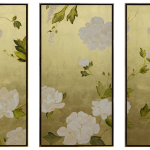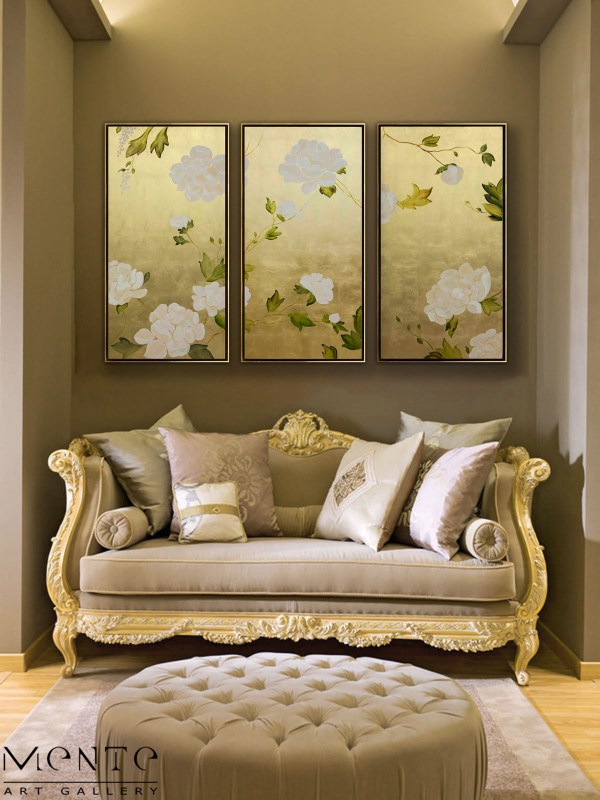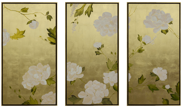 This is a captivating three-part painting that features an elegant display of white flowers on a radiant gold background. The flowers, depicted in various stages of bloom, are beautifully complemented by their vibrant green leaves and stems. The solid gold background adds a touch of luxury and sophistication to the overall composition. The rectangular paintings are arranged side by side, creating a harmonious visual flow. The hand-painted details of the flowers add a unique, personal touch to this artwork. This painting would make a stunning addition to any space, adding a splash of nature-inspired beauty and charm.
