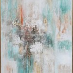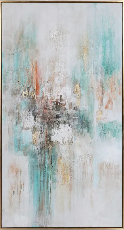 This abstract painting, encased in a modern, gold frame, is a celebration of color and texture. The artwork predominantly features white hues, beautifully contrasted with splashes of blue, orange, and brown. The textured appearance of the painting adds depth and dimension, with areas of the canvas showing through the paint, giving it a raw and authentic feel. The painting is signed by the artist in the lower right corner, adding an element of authenticity. This piece would make a stunning addition to any collection, bringing a touch of modern elegance to any space. Its unique design and exquisite craftsmanship make it an ideal choice for art lovers and collectors alike.
