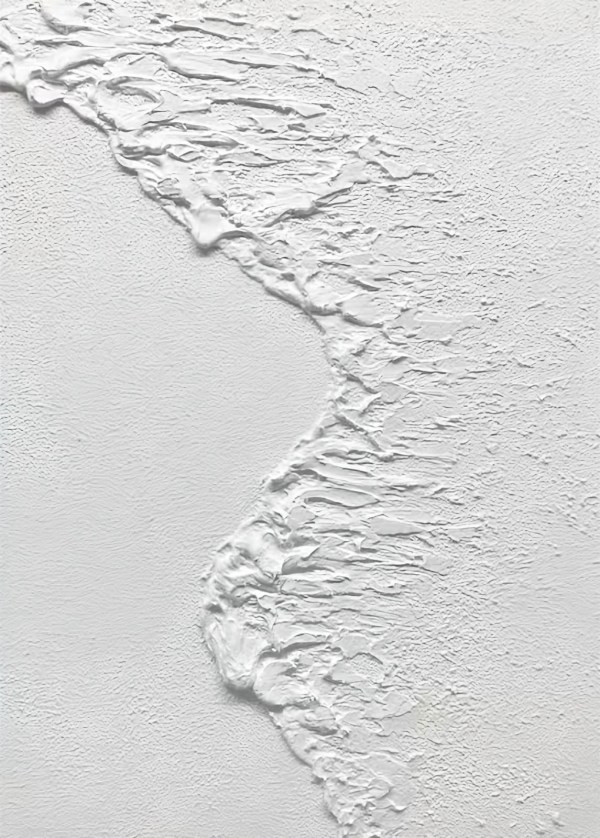 This is a handmade painting that features a close-up image of a white textured wall. The texture is created by a thick layer of paint that has been applied in a rough, uneven manner, giving the painting an organic and tactile quality. The paint has created a pattern that resembles a river or a stream, adding an element of nature to the piece. The image is in black and white, which enhances the texture and pattern of the paint. The lighting is soft and diffused, creating a calm and peaceful mood. This painting would make a great addition to any space, adding texture and depth to your decor.